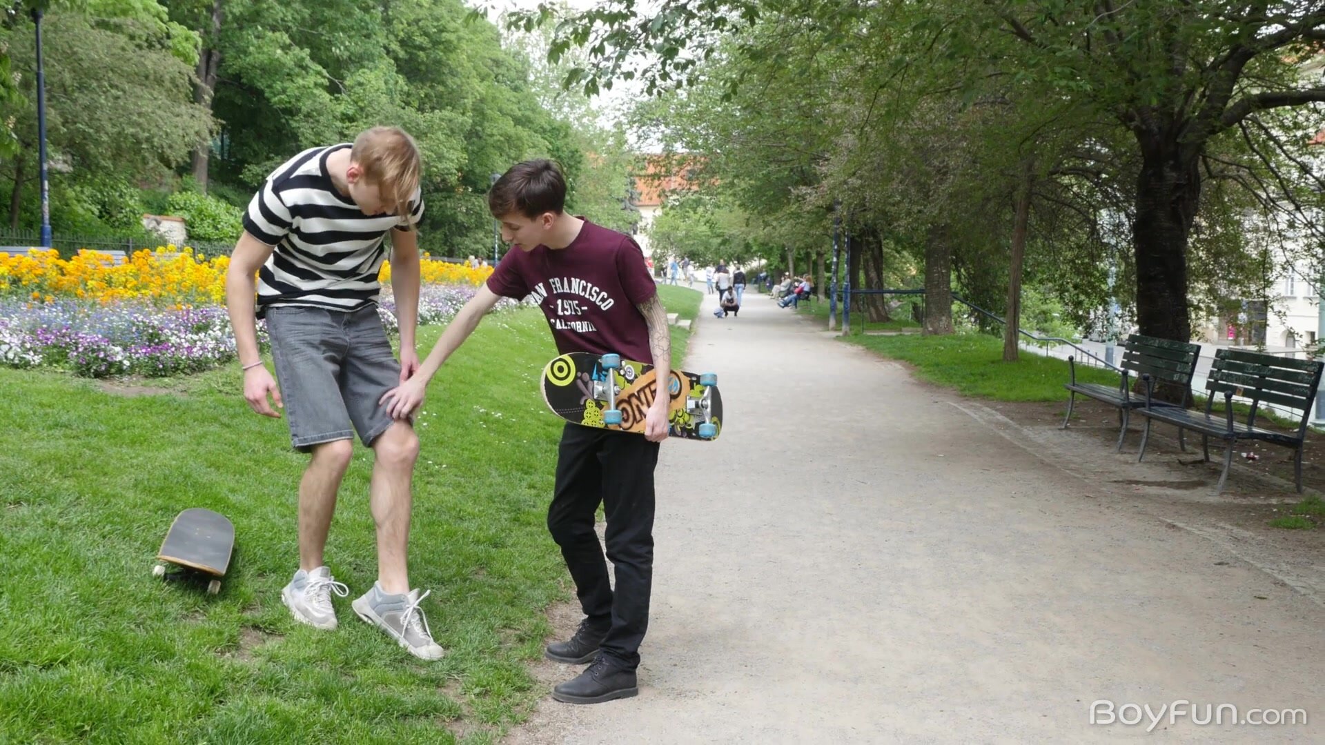 After spending a little while contemplating the busy streets outside his window cute skateboarder Gregor Gilead decides to brave the crowds and head for the park with his board, and it's a good thing he does too because within moments of his stroll in the sun he's encountering handsome and fit young Casper Ivarsson, quickly seeing an opportunity for some BoyFun. They already have a sport in common, both carrying similar boards and seemingly both on their way to the same skate park, but of course they never make it. Casper slips down a slight hill, which makes you wonder how he manages to move on wheels if his feet give him so much trouble. It's a good thing Gregor is there to offer a little assistance and few words are needed to persuade the boy to come back to his apartment and take his weight off his potentially bruised knee. It doesn't seem to matter that Casper is wearing shorts, they're soon off so Gregor can get a better look at the invisible injury. Needless to say, the incredible cock bulge in Casper's underwear is a much more tempting sight and he soon has Gregor exploring it. Shirts are removed and Casper's awesome stiff teen cock is out for Gregor to lick and suck, a task he's more than ready for and something he clearly loves, his own cock is being wanked in his own fist while he services his new pal. The two young men are equally well-endowed, a fact proven when their hard lengths meet for some mutual cock frotting, their foreskins sliding over their glistening tips while their warm shafts grind together. It's quite an innocent activity for a couple of eager boys like these, but be sure the frotting and sucking is only the start. When Casper slurps his new buddy's tool his fingers seek out Gregor's tight pucker, exploring his hole and without words suggesting that his cock might feel good inside it. Gregor can't possibly say no to such an offer, soon impaling his naked ass down on Casper's raw cock, sliding up and down the juicy wet length, wanking himself off with every bounce. There's no doubt the boys are glad to have abandoned an afternoon of boarding in favor of raw butt fucking when Casper eases his bareback tool back inside Gregor's hole for some pummeling on his back, his cock poking in and out of the warm and fleshy hole until he can't take any more pleasure. With moans of bliss he takes aim, ready to deliver a facial for his helpful new friend, the taste and feel of teen cream on Gregor's chin and tongue making his own bulging boner spew out his own goo. It's amazing how quickly Casper recovered from his injury, but that's the power of hard young cock for you!