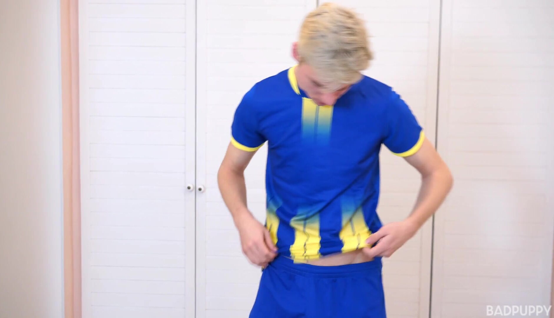 Nick Starlight is admiring the way he looks in his new uniform while tossing his football up in the air. He is wearing no underwear under his shorts and his thick cock is making its presence known every time he throws the ball. Nick pulls up his shirt to tweak his nipples before pulling it off completely and taking a seat on the bench. He grabs the bulge in his shorts and as he rubs on it, his cock grows even longer and thicker. Nick finally frees his dick and as he pulls the foreskin back from the head of his cock, I spy the first sign of pre-cum dripping from his piss slit. He rubs it into his cock and begins slowly jacking his meat. He stands up long enough to strip off his shorts, totally freeing him to get down to business. Nick spits on his cock, lubing it further. He spies himself in the mirror. The sight of his own reflection really turns him on and he begins jerking his cock even faster. As his breathing deepens and his own balls grow tight, he quickly grabs the football. Nick's cock deposits load after creamy white load of his sweet, tasty jizz all over that football. The only thing that would have made it better is if Nick would have licked the football clean when he finished.