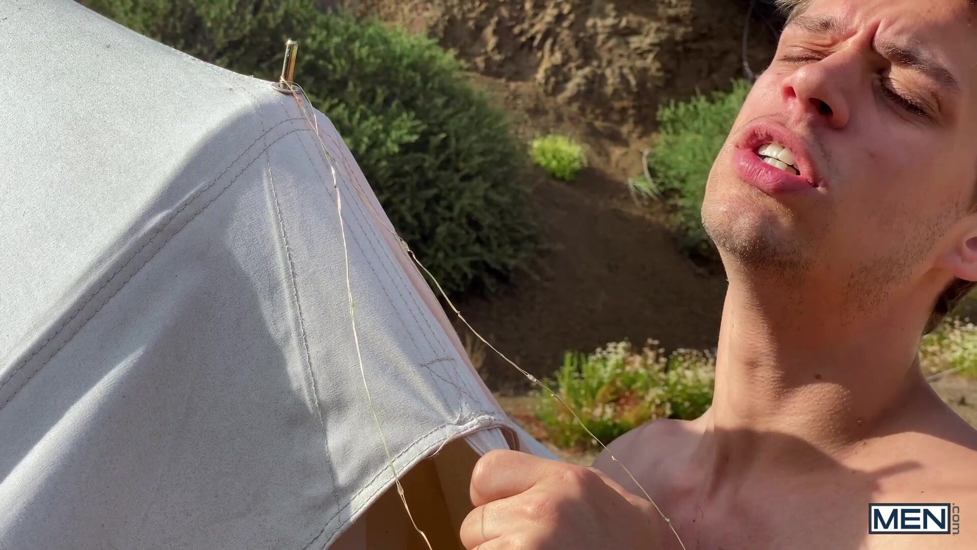 After Michael Del Ray and Nic Sahara pitch their tent at their campsite, Nic crawls inside for a rest, but Michael is pitching a tent of his own in his shorts. He sneaks inside and rubs his cock over the sexy bottom's booty, getting Nic all hot and bothered. Michael goes outside to take a leak in nature and catches Nic jacking his pole when he returns, so he sticks his wood through the tent flap for Nic to suck. Nic swallows the top's erection and Michael comes inside so he can return the favor before telling Nic to sit on his rod. As Michael fucks his ass mish, Nic rubs his wood like he's trying to start a campfire till he cums, and the top pulls out and blows a big load on his hole!