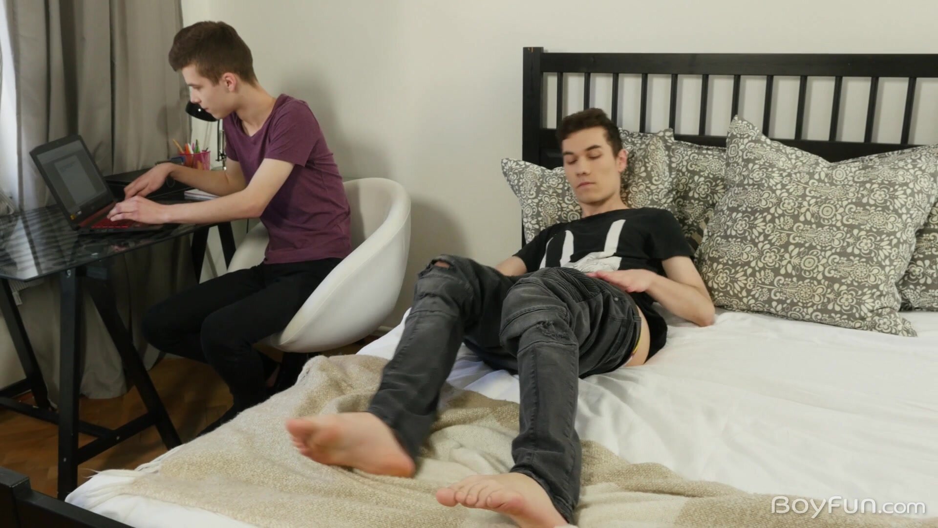 Cute little Axel Bolt is a studious young man who takes learning extremely seriously, he would just die if he got a B on a test. But, even boys as dedicated to their studies as he clearly is can't possibly ignore the opportunity for some BoyFun, especially when it's a horny friend as sexy as Nathan Reyes offering it. After initially failing to entice his buddy away from his computer with merely the suggestion of some fun, he goes nuclear and hauls out his long uncut cock. Most boys would have been on that dick the second it was offered, but although Axel was reluctant at first he can't refuse when he feels that warm length in his grip. With a little kissing Axel is pinned on the bed, a naked Nathan straddling him, his cock bulging and demanding some love. After working his way down to Axel's package he finds a delicious young dong waiting for him, glistening with precum, rigid with delight as it slips between his lips. The moans of bliss start in earnest when Nathan shows his oral skills, gobbling his pal's prick and soon sharing his own engorged member with his adorable little friend. With their smooth and slim bodies totally free of clothing and their cocks raging for more pleasure Nathan takes the lead, sliding his naked hole down on his friend's cock and riding him, his own big boner swinging and bouncing, bulging in his stroking hand while he fucks himself on his pal's cock and jerks off. On his knees and fucked from behind Nathan gets it even deeper, little Axel's hips humping up against his ass cheeks, the boy's stiff dick sliding inside him and hitting that sweet spot. All thoughts of tests and papers are momentarily absent from the boy's mind as he spoons his friend and then fucks his pert little buns from above, finally pulling out and laying back to blast his teen cream right in Nathan's waiting face. With the taste of Axel's cum on his lips he wanks off, thick cream pumping from his foreskin sheathed helmet, kissing his buddy while the climax flows through him. All hard working boys deserve a break from time to time, Axel has just learned the truth of that.