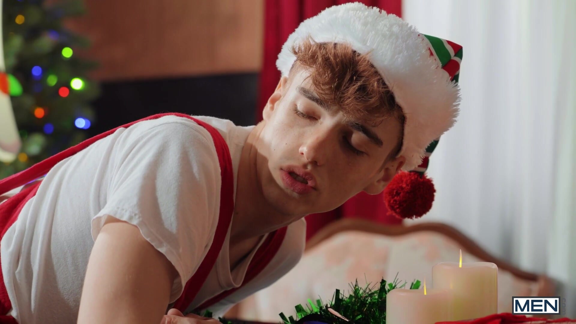 Bored elf Elf (Tannor Reed) is listening to Santa check his list yet again when delivery guy Chris Damned arrives with a package just for him! As Elf accepts the special delivery, the box comes open and all the dildos he ordered spill to the floor! Elf bends over to sign for the parcel, and Chris admires his red-clad, elfin ass. The horny top starts to get hard, and Elf hurries to suck his big cock. Chris tears open the bottom's overalls, spitting on his hole, then sliding a finger inside before stretching him with one of his new dildos. The top fucks the horny elf doggystyle and missionary on the desk till Santa catches them - but he just encourages Chris to fuck his elf even harder! Elf rides Chris's cock on the desk till the top pulls out and cums. Chris Damned is definitely on the naughty list for good!