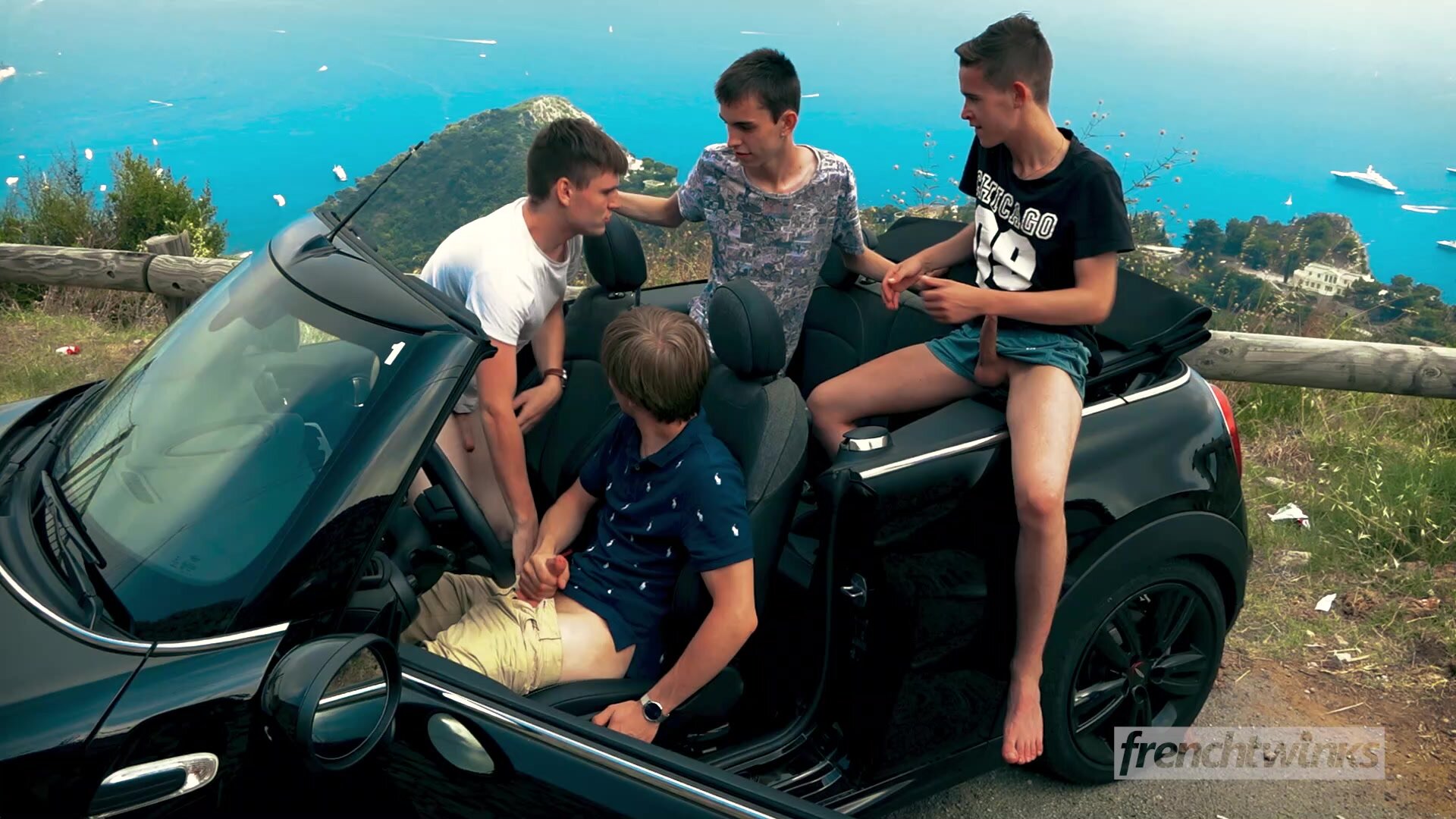 Justin and Lucas go on a little trip around the French Riviera and while they drive, hair in the wind at the seaside, they see Ethan and Maël below looking at the breathtaking view of the bay. Justin stops by the side of the road and the couple decides to get a closer look at these two pretty twinks.