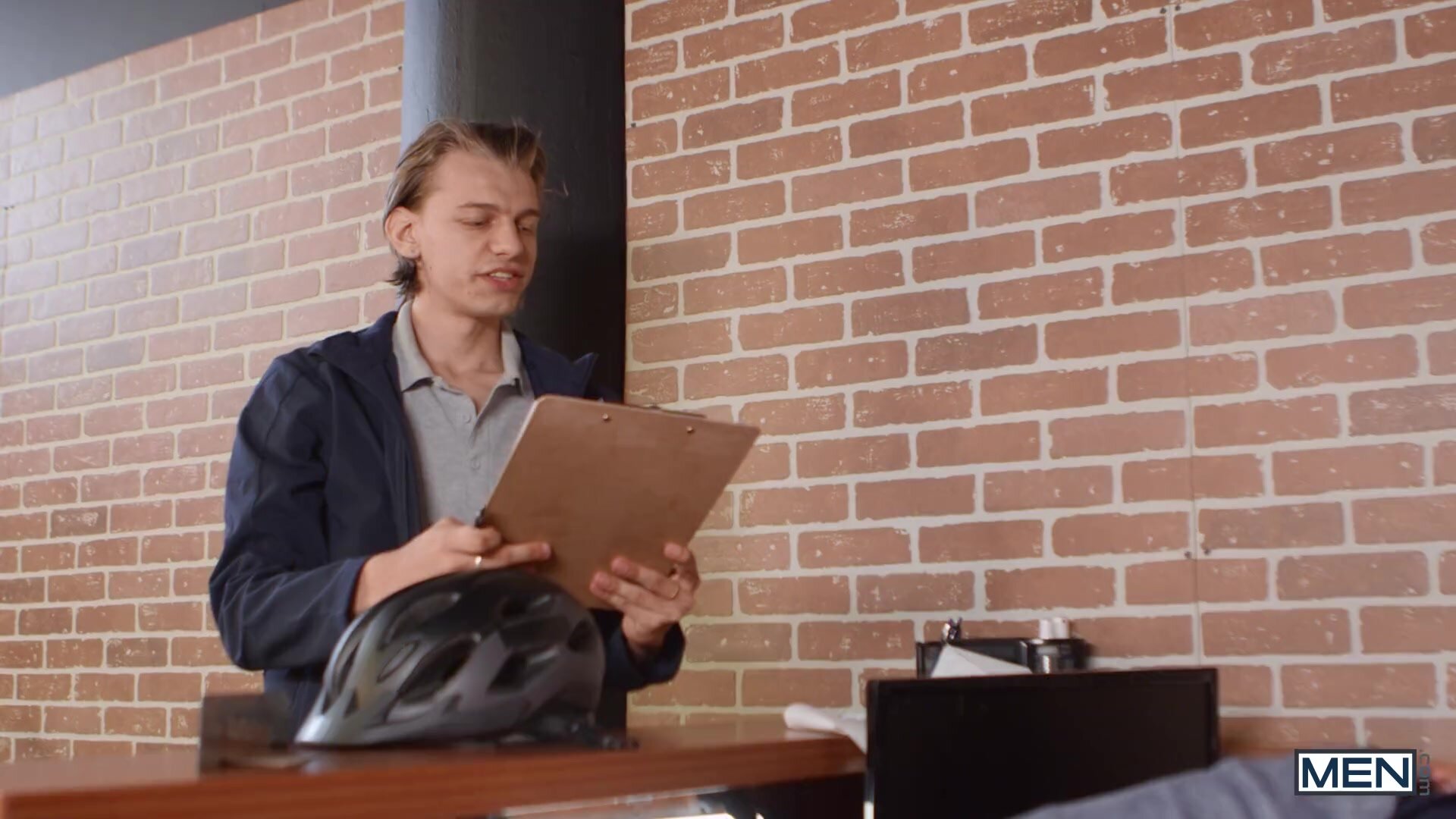 Bike messenger Malik Delgaty has everyone in the office staring at him when he comes in wearing only a small tank top and short shorts! All the guys ogle his big muscles and his impressive bulge and ask to touch his shirt, and Malik decides to show off a little bit. Boss Lev Ivankov is really into biking, and he's even more into sucking Malik's big cock! Malik bends the boss over the reception desk and fucks him doggystyle, then undresses him as the slim bottom rides him on a chair. Malik picks up Lev's legs to fuck him as he hangs off the edge of the desk, then puts him on the floor to penetrate that ass in missionary before he cums on the boss's face!