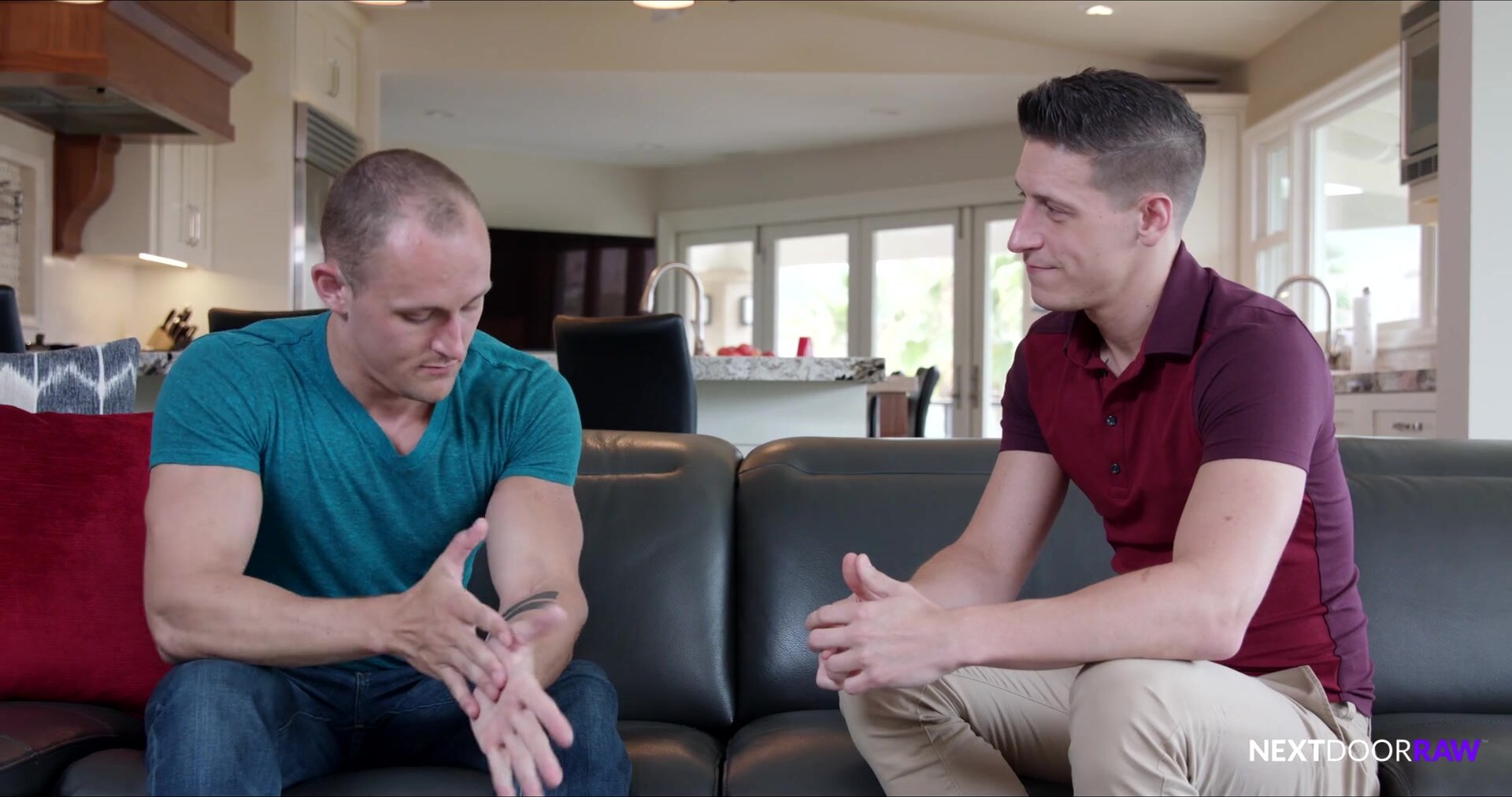 'No, this is,' Dalton replies, suddenly grabbing Trevor's waistband and exposing his rock hard cock. Dalton takes it into his mouth as Trevor lets out an audible moan. He feels Trevor throbbing in his mouth before bending him over to eat his ass. Tonguing his hole, he strokes himself hard before plunging his cock deep into Trevor. Trevor gasps as Dalton works it in, and before he knows it, Trevor's cherry is popped, and Dalton is 8 inches deep inside him. Dalton shows him how it's done, easing his dick in and out before picking up the pace. He lets Trevor take a ride as he squeezes his perfect ass. Trevor proves his natural talent, but Dalton wants to see his versatility, so he flips onto his back and tells Trevor to fuck the cum out of him. Trevor, now on top, slides his cock into Dalton and spreads his legs, fucking him hard as Dalton strokes himself off. Watching Dalton jizz all over himself triggers Trevor to want to nut, so he pulls out and feeds Dalton his load, spraying all over his face as Dalton tries to lap it all up.