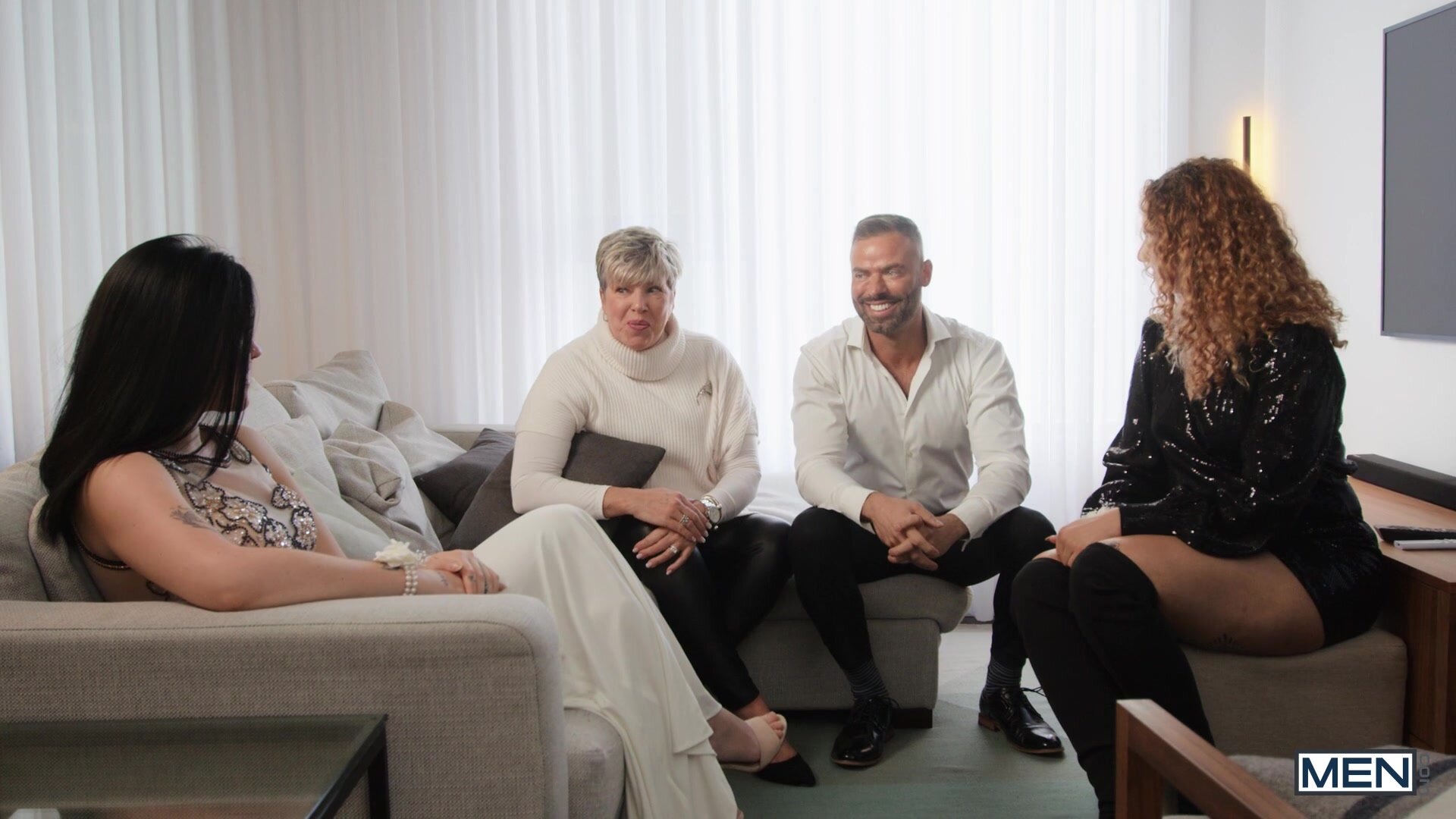 Enzo Muller and his boyfriend, Leo Louis, don't want anyone to know they're dating, so they're bringing a pair of sisters to the senior college prom. Enzo wants to sneakily play as they're taking pictures with their dates, but Leo shuts him down... so Enzo goes upstairs and walks in on his date's brother, Malik Delgaty, jacking off! Malik is happy to get his dick sucked, and then he fucks Enzo doggystyle. The bottom gives a gleeful grin and the finger when Leo walks in on them, then rides Malik and takes it deep in missionary before taking a creampie and a facial, then jacking off till he cums.