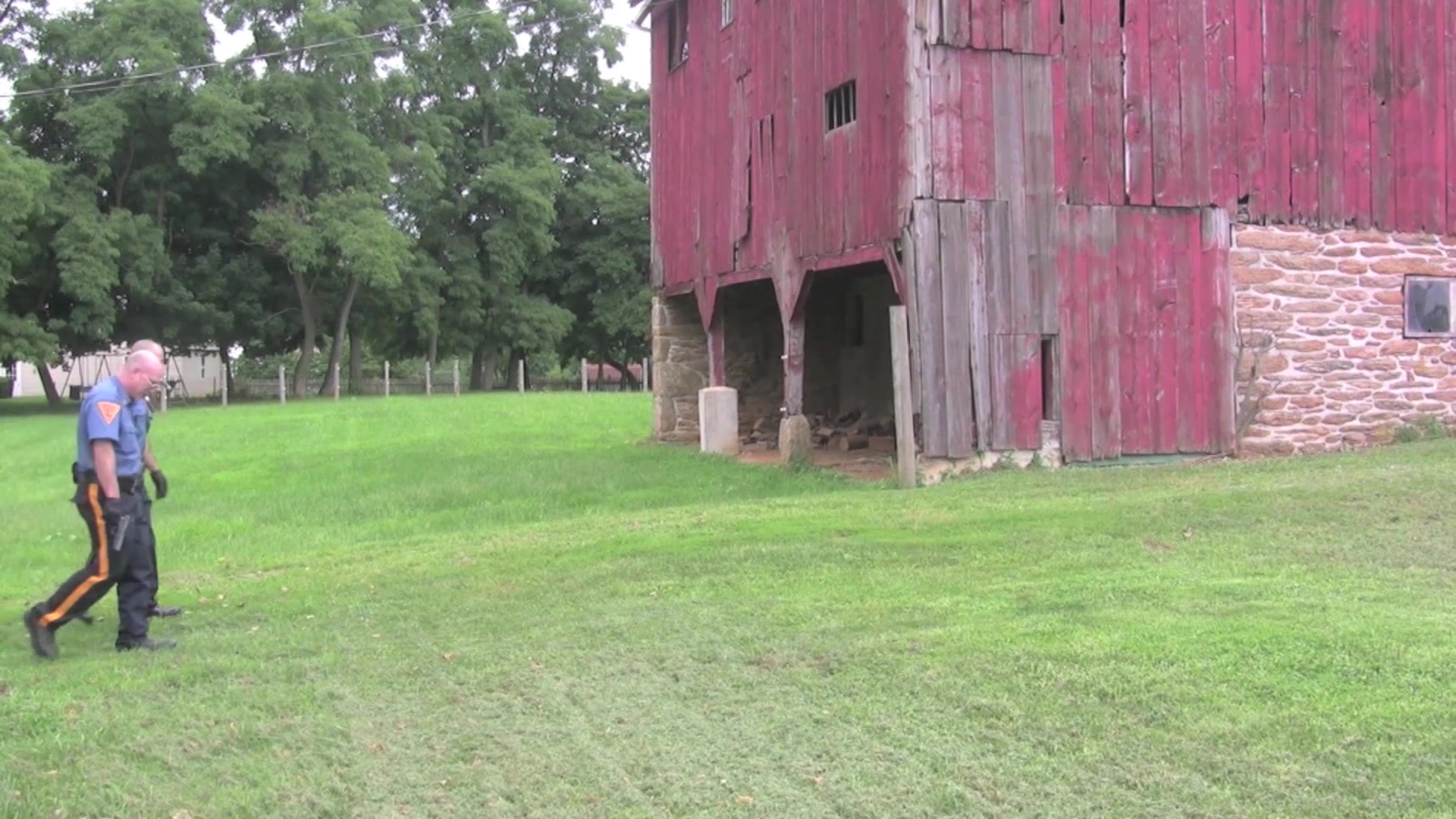 Officers Rob Jones and Butch Grand have just finished a shift and decide to hang out and have a few beers. Jones leads Grand to one of the barns on the farm, pulls out his gun, and puts Grand through the paces.
