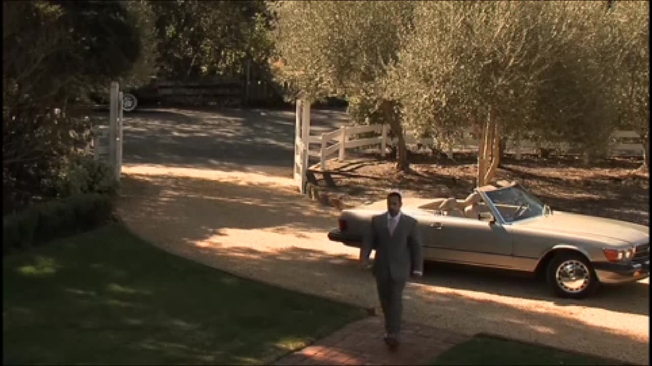 A dashing and debonair Adam Champ arrives home in style, pulling into the driveway in his Mercedes Benz convertible and dressed in a 3 piece suit.