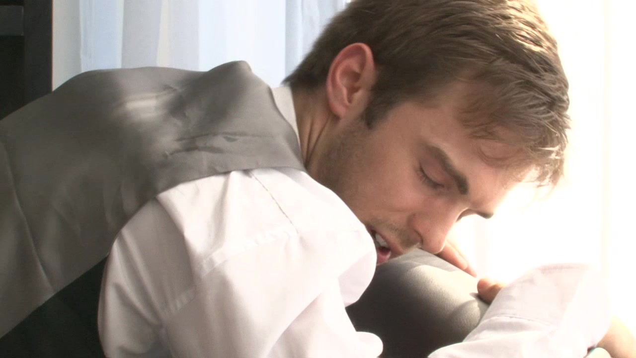 Taking up residence in a posh apartment, the suave Gabriel Lenfant and Nick Ford sneak away from the office for some passionate romance. They grab one another's finely tailored suits and smack lips, making out with intertwined tongues. Nick's hands remain frisky the entire time, and he coaxes out Gabriel's uncut dick and sucks on it until he's rock hard. Nick's cock is next: Gabriel pushes Nick to the sofa and unleashes his member. Nick loves playing with Gabriel's mouth, teasing his tongue with the head of his prick. Both Gabriel and Nick are quiet gentleman: they swap oral and rimjobs with low and passionate moans. But Nick wants all of Gabriel: he bends the gorgeous brunette over the sofa and invades his ass, pounding him with intense lust. While Gabriel is still wearing his dress shirt and vest, Nick tears off all of his clothes and fucks Gabriel completely nude. Nick is a versatile lover, though, so he doesn't resist as Gabriel flips him onto the sofa and slips his huge erect dick inside. A key moment is when Nick lowers himself onto Gabriel's cock and rides him to ecstasy. They both cum in each others mouths and passionately kiss to finish their tryst.