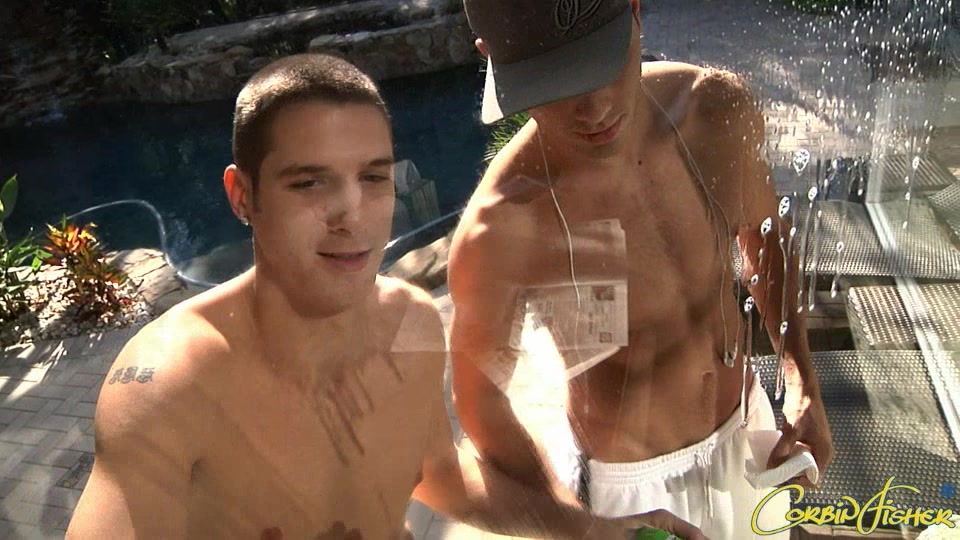 After working up a sweat sweeping and cleaning the windows, as well as the pool and driveway, Trey cools Preston off with the hose. They dry off in the sun, then Trey takes him inside … where he will be playing with a different kind of hose! Trey tells us the funny story of how he blurted out making the Dean's List here at CF in front of a friend and the friend said, “I didn't know you were in school.” And Trey responded with, “well, not exactly...” However, he is definitely working his way up to being one of our Student Faculty … and new freshman Preston is ready for some guidance! They joke around for a minute about “man-love,” then Trey starts kissing Preston. Preston responds eagerly, and all thoughts of his girlfriend are left in the dust. Trey kisses his lean chest and rubs his stomach. Preston watches him, fascinated by the look and feel of another guy caressing him. They kiss again. Trey has him kiss his chest and abs. Preston hungrily kisses Trey's ripped body. Teasing his way down Preston's body with his mouth, Trey kisses Preston's stomach and groin. Preston is ready to pop out of his shorts at this point. Trey asks if he's ever been touched this much by a man, and Preston says no. It's turning him on though – especially as Trey slowly pulls the shorts off of his new student. Preston's cock flops out and Trey strokes it and sucks it. His hard cock stiffens even more in Trey's hot mouth. Trey makes his balls bounce as he jerks that dick before swallowing it again. Trey pulls out his own big cock and Preston sucks his first dick. He eagerly goes up and down, and Trey says he must have done this before. Under Trey's guidance, Preston is able to open his mouth even wider and take almost all of Trey's entire cock. Getting into a 69 position, Trey slaps his cock against Preston's face before shoving it down his throat. Trey then spits on Preston's cock and slides down on it with his hot ass. Riding him cowboy-style, Trey's perfect ass sucks Preston's cock deep inside. Preston thrusts up into Trey. Trey grins, and says he knew Preston would like fucking his ass. Trey gets on his knees and tells Preston to fuck him. Preston smacks Trey's ass and shoves his dick hard into him. Trey loves cock and he tells Preston how he's loving that cock in his hole. Trey moans in ecstasy as Preston pounds away at him. Laying on his back, Trey guides Preston's cock into him. It's only a moment before Preston fucks a huge load out of Trey. Cum sprays all the way up to Trey's chest. Trey pants and moans as Preston continues to fuck him. Then Trey gets his mouth filled with Preston's cum. He slurps it down, and then cleans Preston's dick with his tongue. Looks like Preston figured how just how hot “man-love” could be.