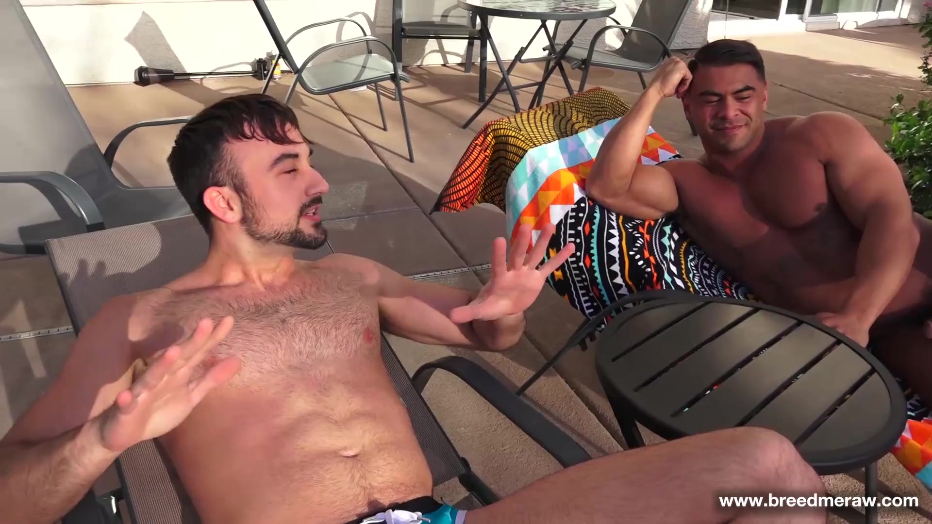 Bodybuilder Draven Navarro is laying by the pool naked, his big dick hanging out, when his roomy, Mason Lear, comes and joins him. Now that they have a house with a pool they want to have naked pool parties, but Mason is more interested in getting in Draven's big ass again. Draven must take a call in the house but that does not stop Mason from following him in and shoving his face up that big ass and getting a little taste of slut hole. Draven, of course, just spreads his ass and wants more than just tongue. He wants it all and raw! Mason shoves his stiff rod up there and pounds away making Draven squeal like a little slut pig. Now THAT is how you treat a muscle hole!
