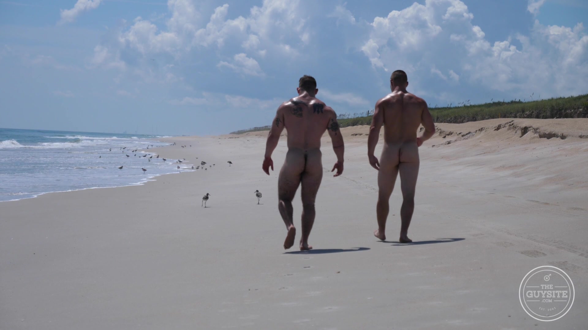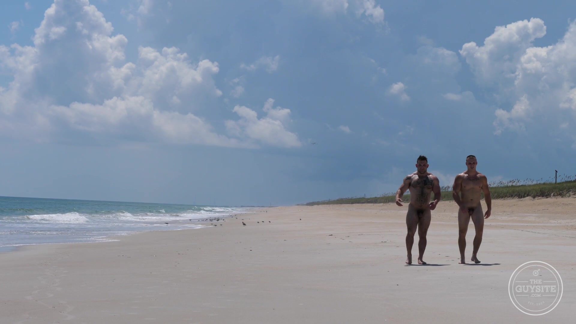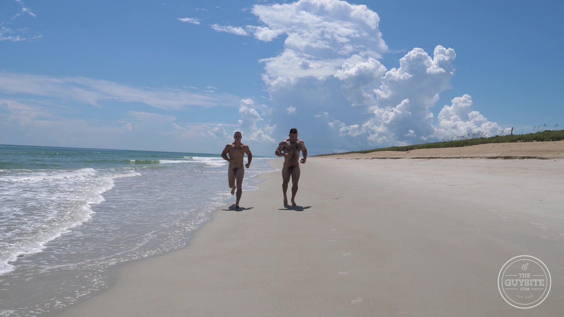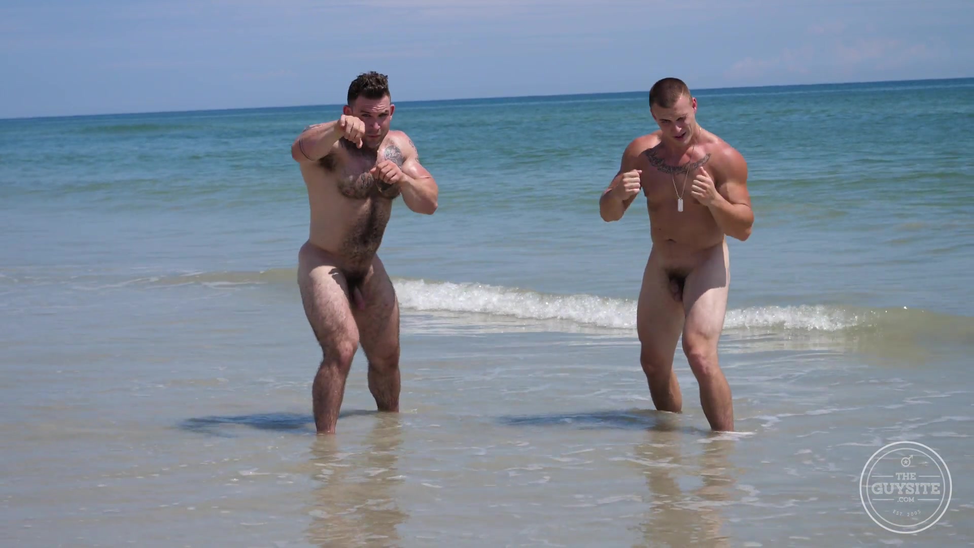 Our musclemen Jack and Jason head to the beach to do a little naked running, posing, horsing around in the water. In part 2 you'll get to see them in bareback action.