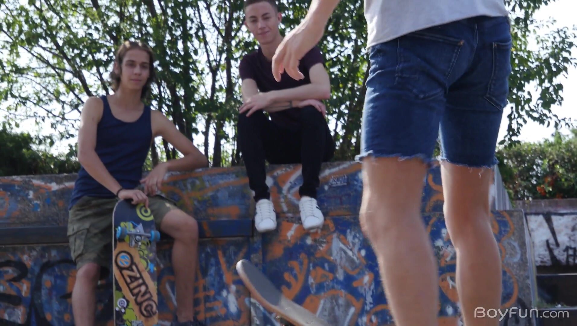 Description: (Models Alec Loob, Jake Olsen). Every teen these days knows that if you want to find some fit and curious twinks to share your cock with the skate park is one of the best places to be. Alec Loob might not be too good with his board, but he's not really there to show off his lack of skills, he's there to get the attention of long-haired boy Jake Olsen. His flailing seems to do the trick and while Jake might have originally considered just giving the boy some tips on his learning method he's soon following the twink back to his place for some dirty BoyFun! Alec might not be great on wheels, but when it comes to sucking on big uncut cocks he's had plenty of practice. The boys make out, revealing their incredible young dicks, jerking each other off and swapping oral with obvious delight. Jake's incredible dick is so long and slender, so tasty too, and with just a little taste Alec is desperate for more. There's no denying that these boys are well-matched in the cock department, and in their skills at pleasuring a wet young piece of fuckmuscle too! With their young swinging balls slowly filling with cum to squirt Alec is eager to get that big bare boner up his butt, laying back to welcome his new friend inside. The smooth and slim twinks ae quickly in heaven, their moans of bliss filling the room while adorable Jake gives his friend a ride on his uncut shaft. With their balls bouncing and their dick tips almost dripping pre in anticipation of the climax to come the two break for a moment of ass-to-mouth oral, then it's right back to the hole filling action they've come to love so much. Pounded from behind and with the pleasure becoming too much to bear Alec squirts over his stomach, the sight and smell of fresh semen enough to have Jake pulling his incredible dick out and wanking his own erupting cream from his shaft! Maybe Alec should forget the skateboard and stick to fucking, it's where his innate skills are!