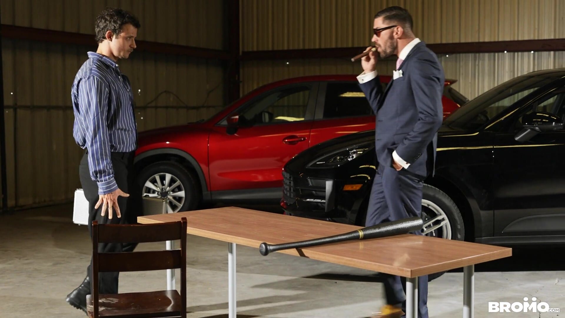 Nate Grimes has good reason to be nervous as he waits for mobster Chris Damned holding a briefcase full of cash. The tattooed criminal immediately figures out something's up, stripping Nate to find the wire taped to his chest, and running his hands all over the go-between's body to find a stack of cash stuffed down the back of his pants! There's more money missing, so Chris bends Nate over the table, leisurely removing his expensive suit as he rims the nervous bottom, then fists his hole. Despite Nate's best efforts, Chris finds the roll of cash stuffed up that ass, pulling it out and replacing it with his cock instead! Nate makes it up to Chris by sucking him and riding his dick reverse. Then the mobster fucks the power bottom with a baseball bat as Nate jacks off till he cums, and Chris shows him who's boss with a facial.